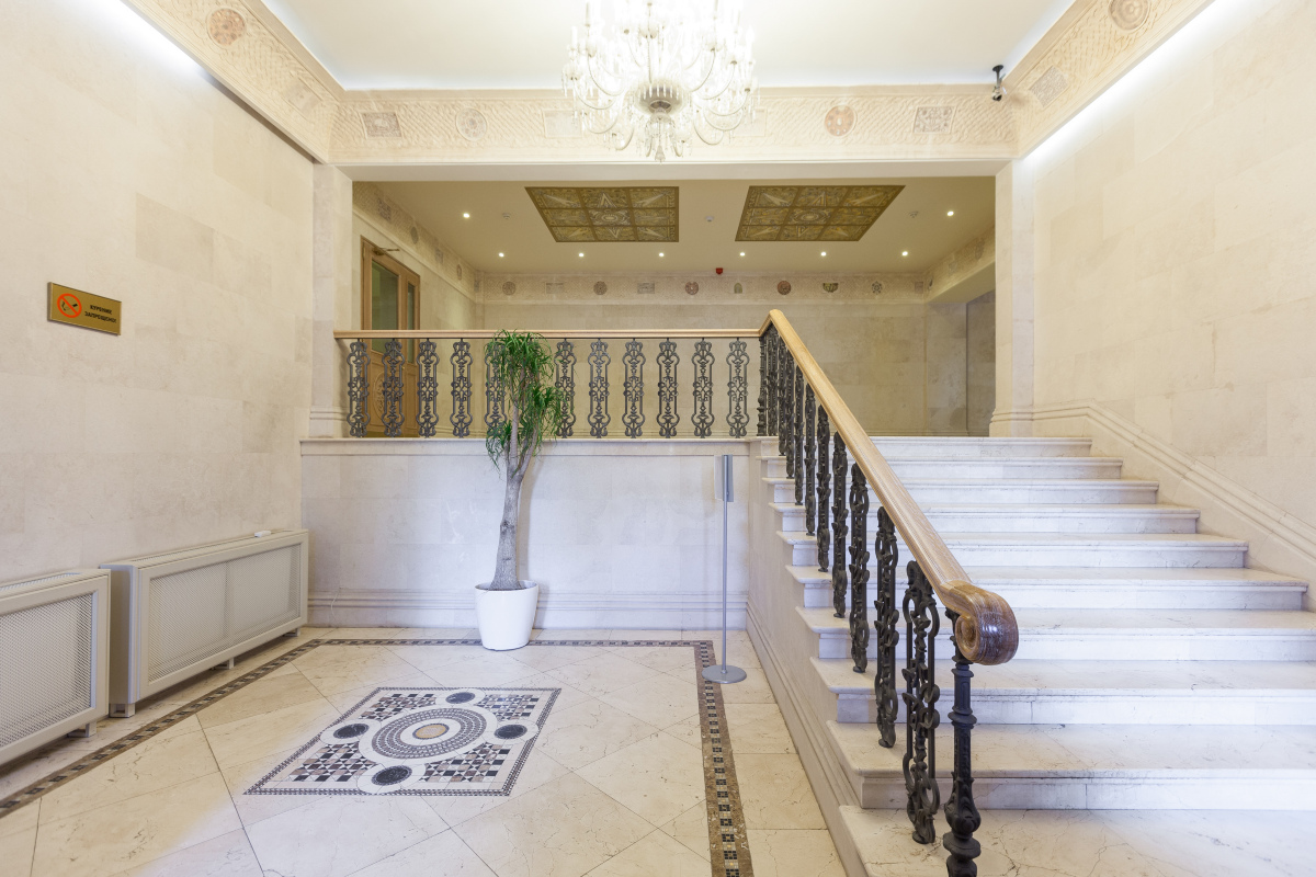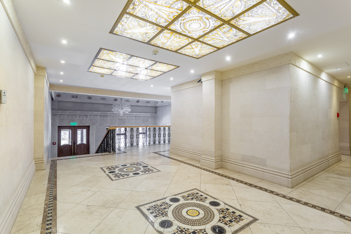 На первых этажах ЖК Остоженка Парк Палас роскошные лобби с отделкой из натурального светлого камня. Широкие лестницы из гранита и кованые перила придают общественным холлам элегантность и парадный вид. Предусмотрен трехуровневый подземный паркинг на 600 машиномест и гостевая стоянка. Комплекс огорожен и находится под профессиональной охраной.